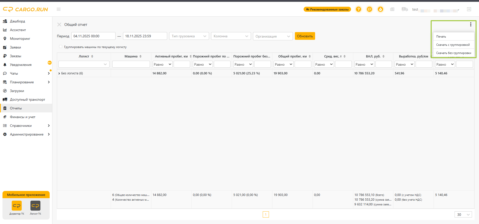 Общий отчёт позволяет анализировать эффективность работы парка в режиме реального времени с детализацией по ключевым метрикам. Он отображает ключевые показатели парка: общий пробег, гружёный пробег, порожний пробег, валовую выручку, руб/км и рубль в час — отдельно по каждой ТС, по логистам и в целом по парку.