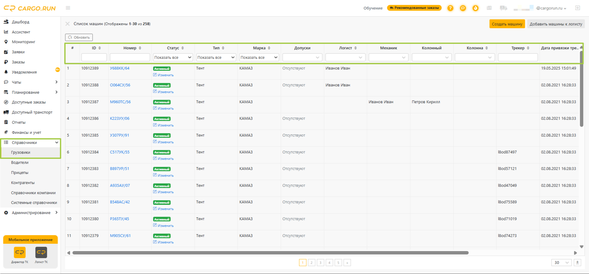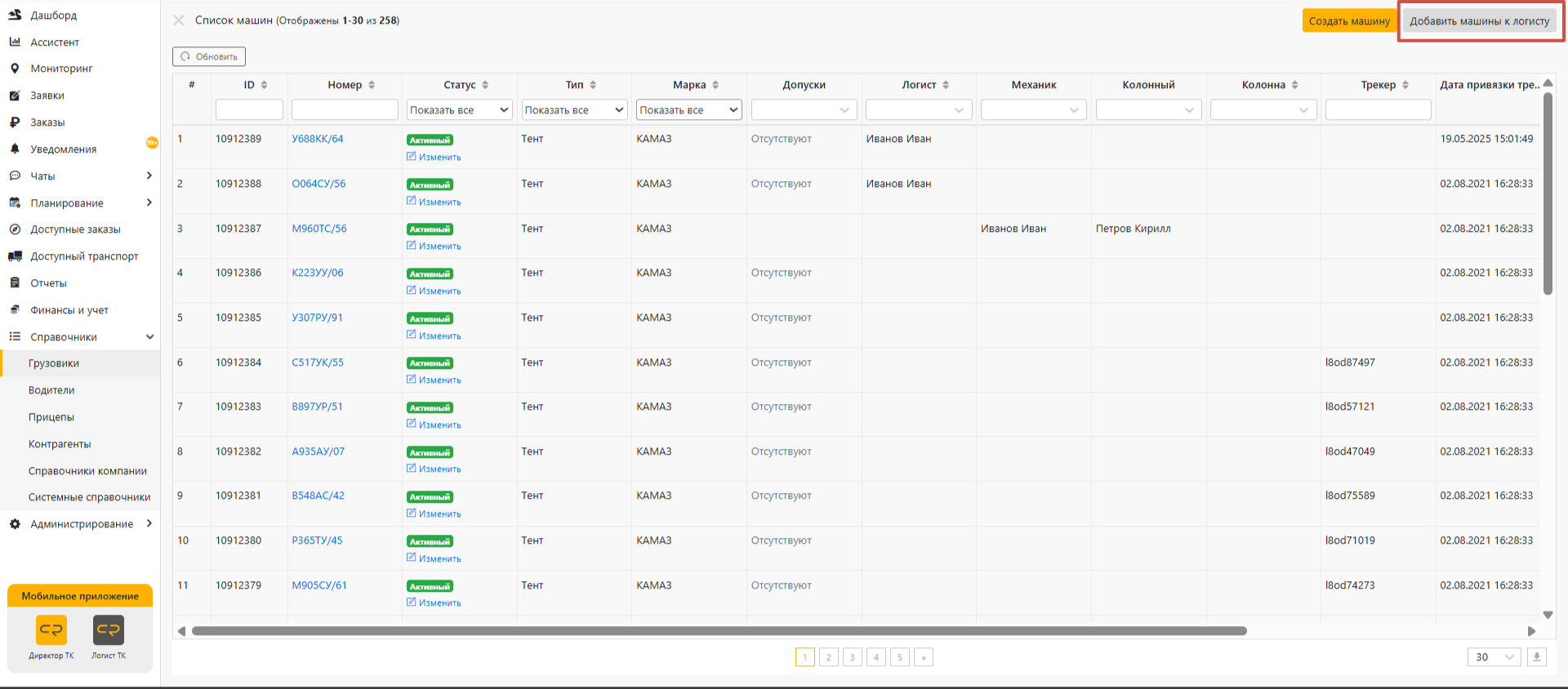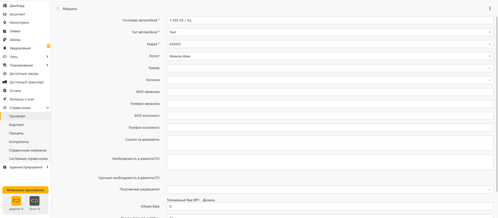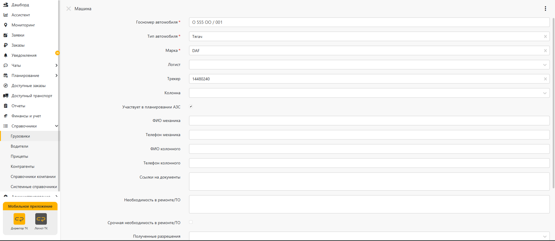 Когда вся информация внесена, нажмите «Принять». Новый грузовик появится в общем списке машин, а его данные будут отображаться в заявках и других разделах.