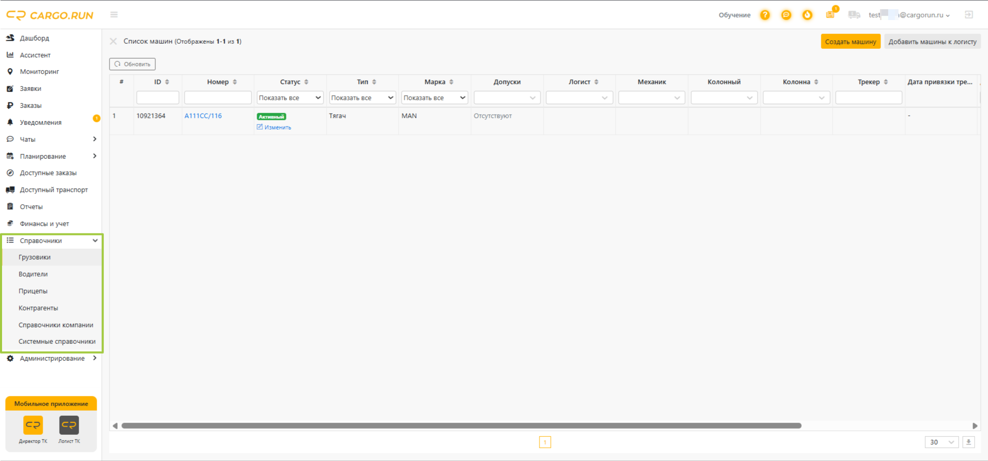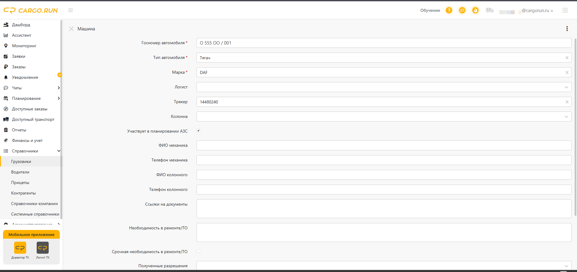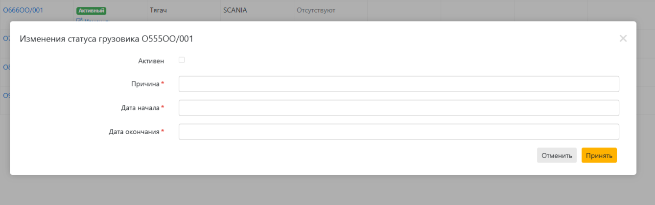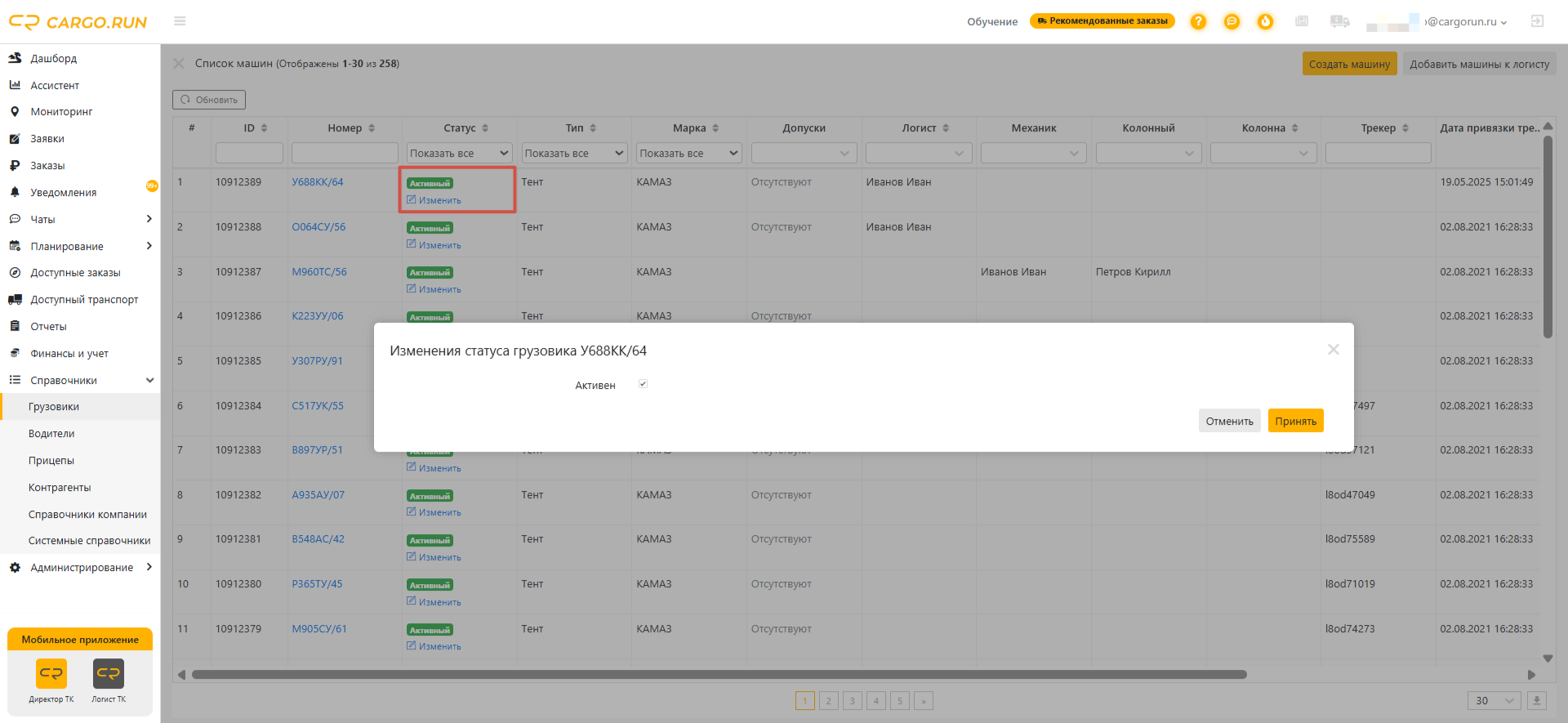 Когда вся информация внесена, нажмите «Принять». Новый грузовик появится в общем списке машин, а его данные будут отображаться в заявках и других разделах.