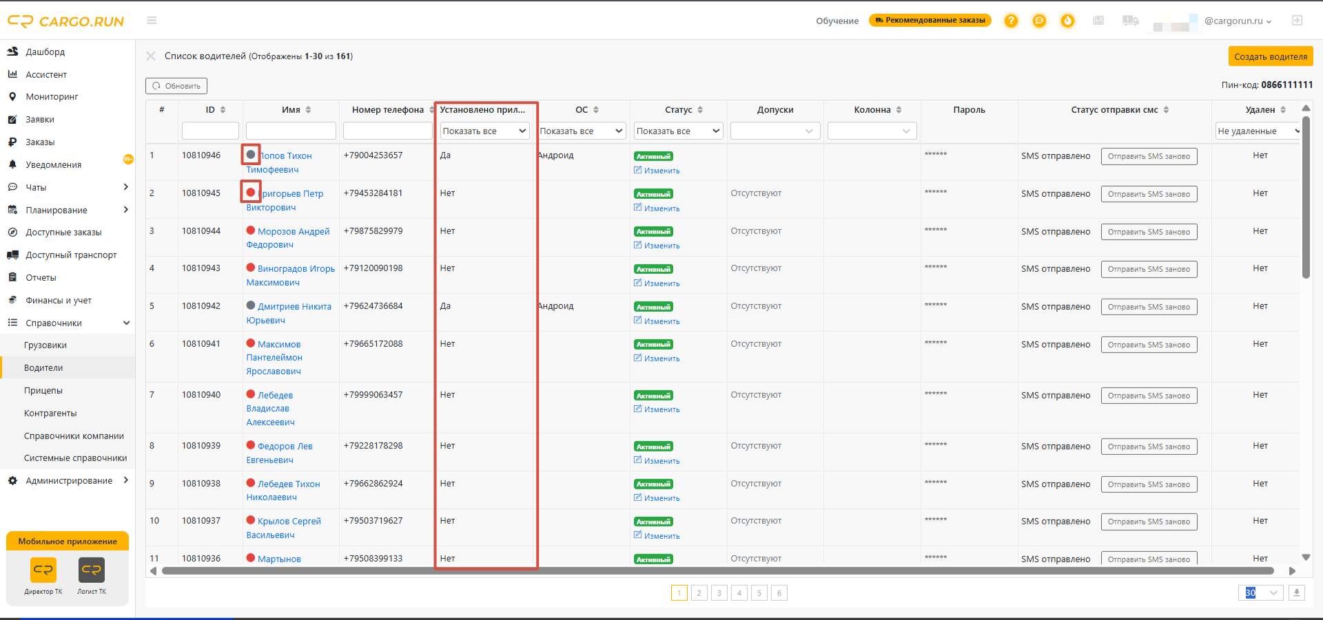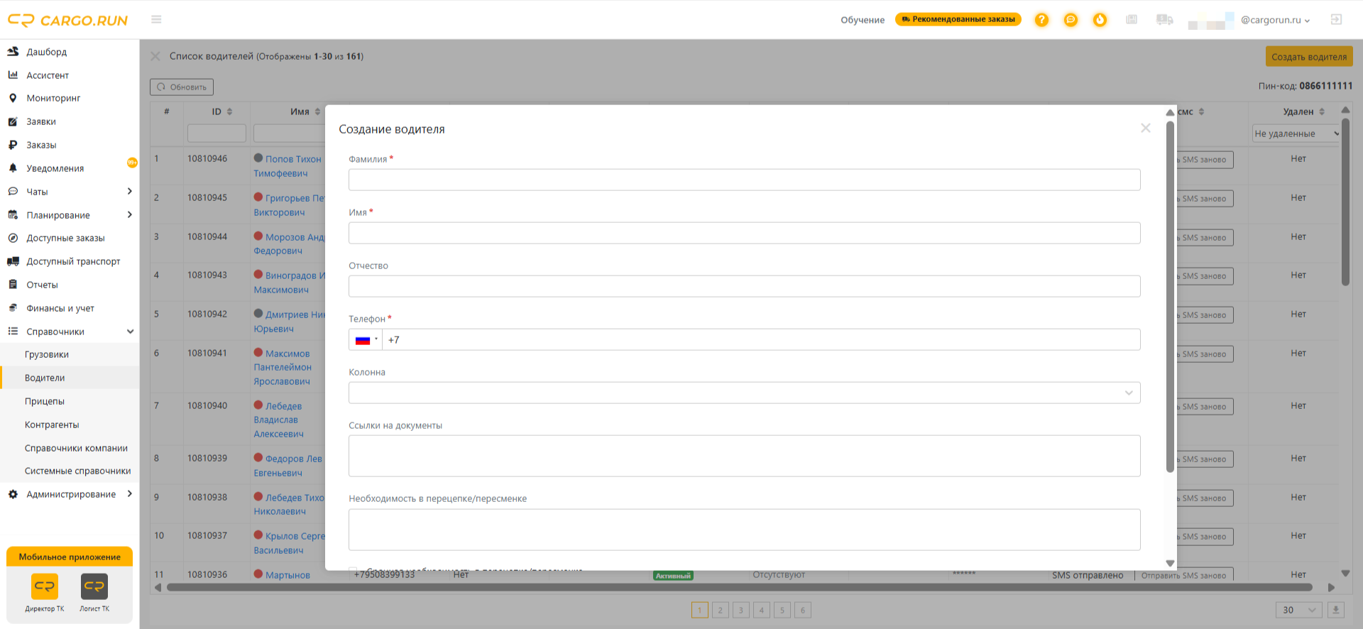 При добавлении нового водителя система автоматически отправит ему приглашение на телефон. Он получит ссылку для установки мобильного приложения «Водитель», свои логин, пароль и ПИН-код вашей организации для первичной авторизации. Через приложение водитель будет видеть данные по заявке, отчитываться по ней, прикладывать документы и так далее.