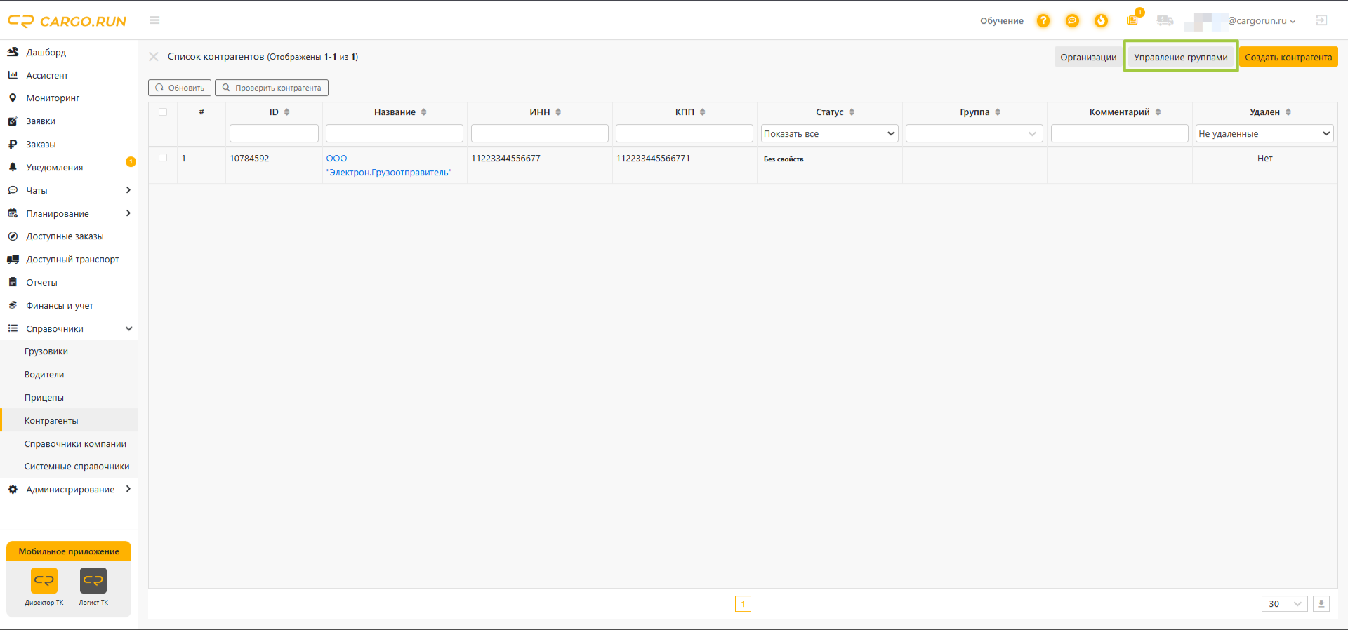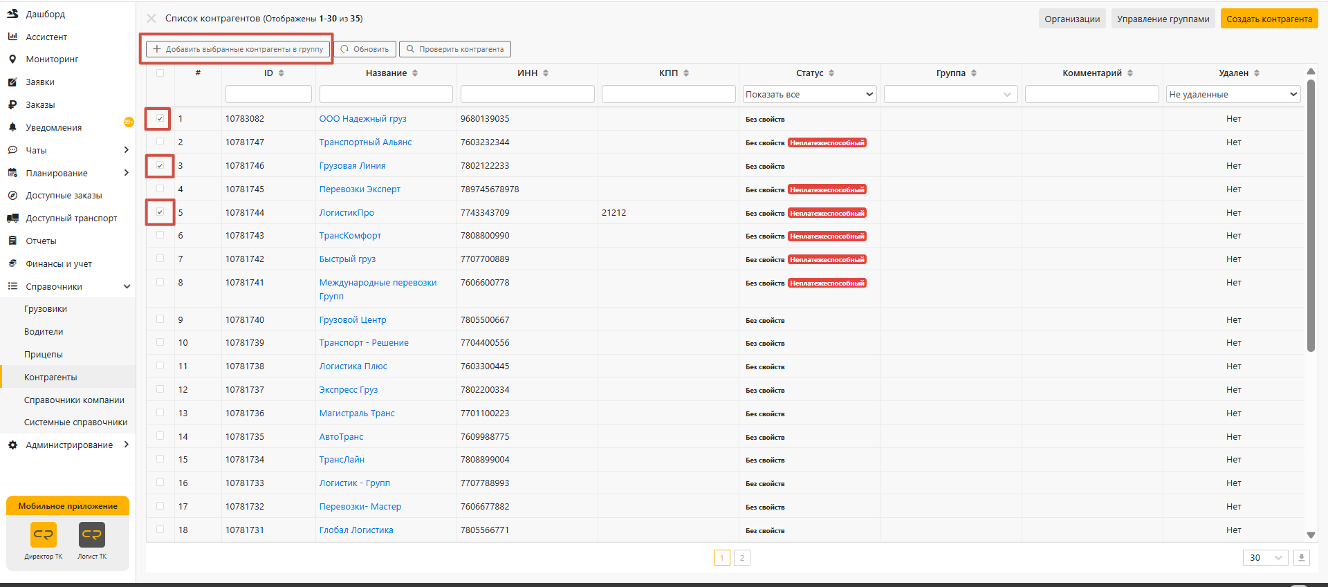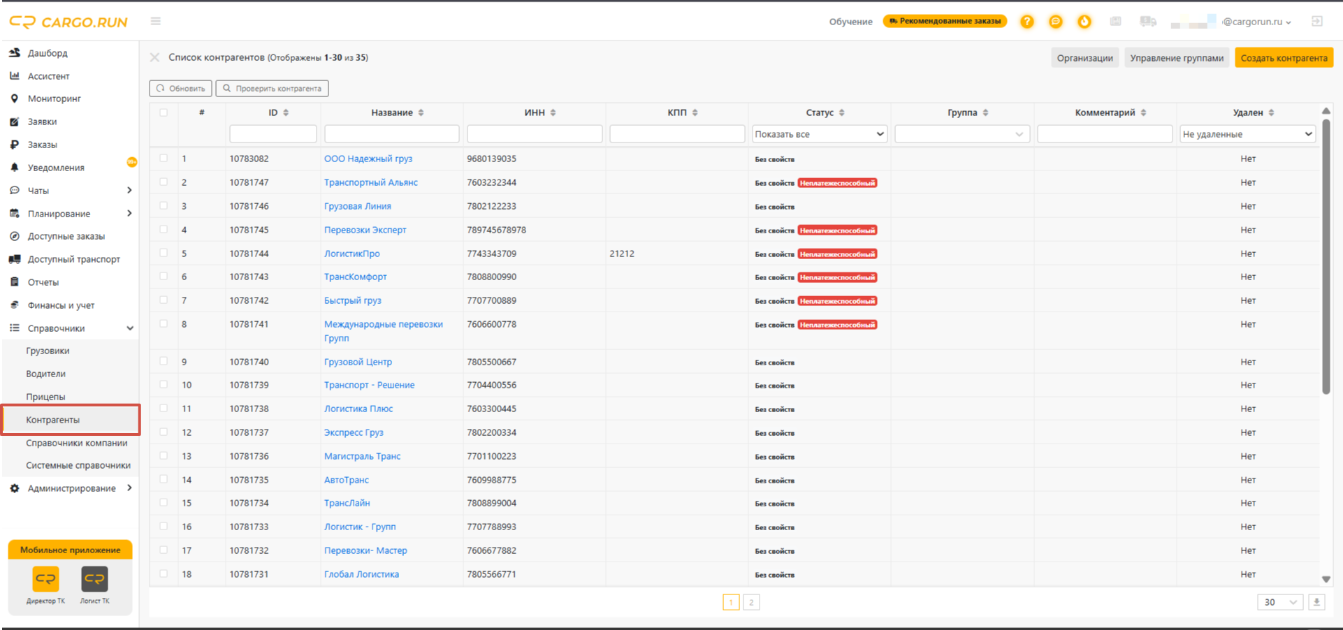 Если клиент систематически задерживает оплату, установите опцию «Неплатежеспособный» и оставьте комментарий (например, «постоянные задержки на 30+ дней»). Комментарий будет виден при создании заявки и в списках. Более того, он попадёт в общий реестр CARGO.RUN, предупредив и других перевозчиков.