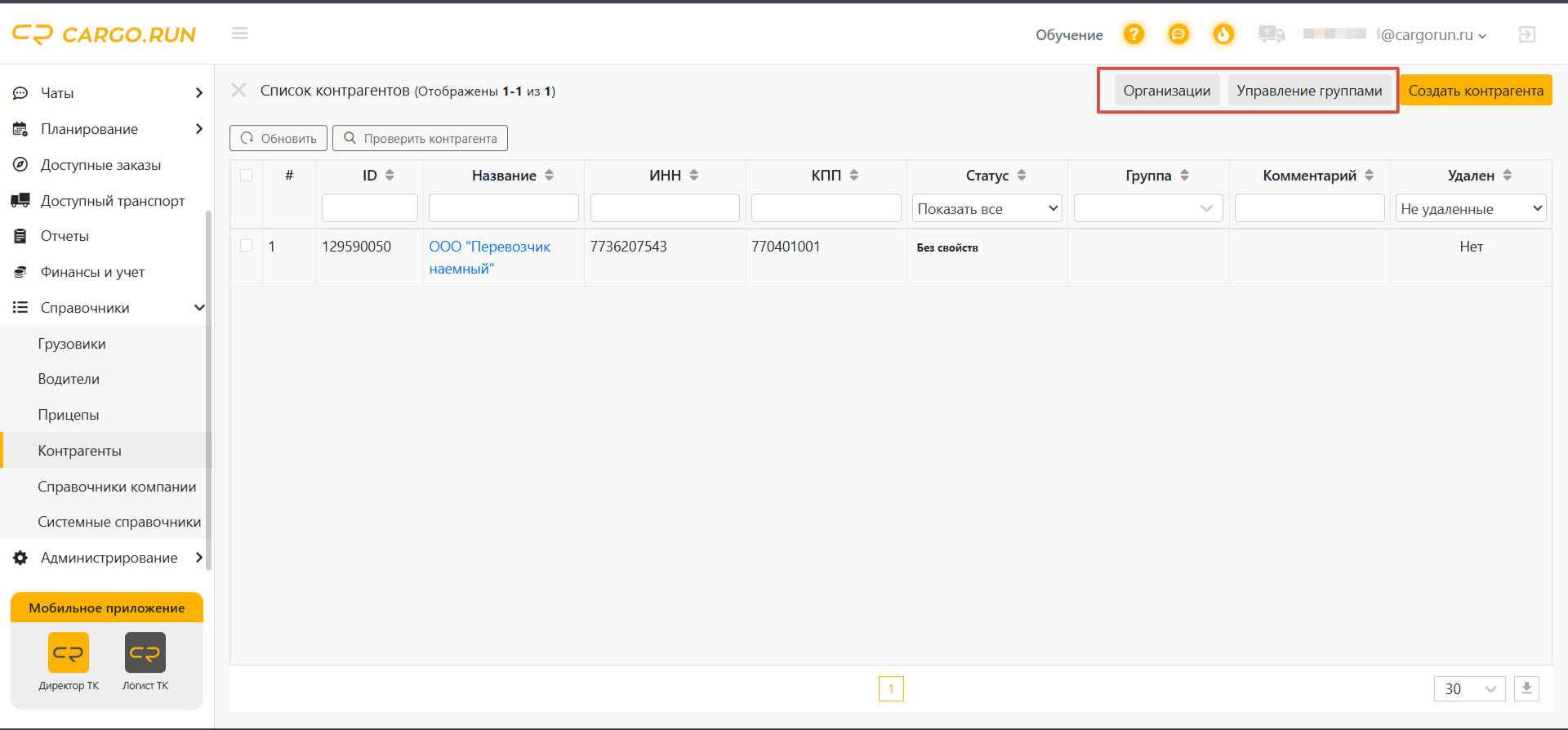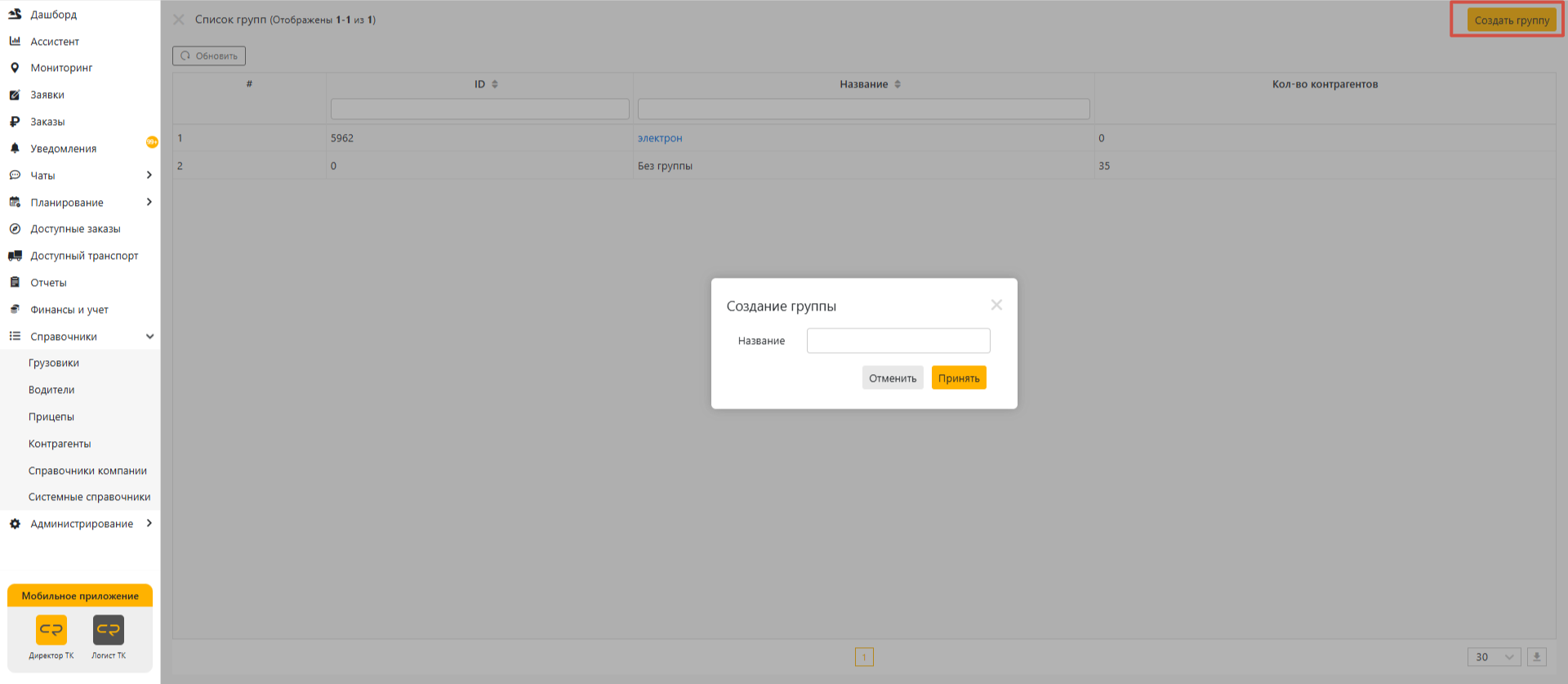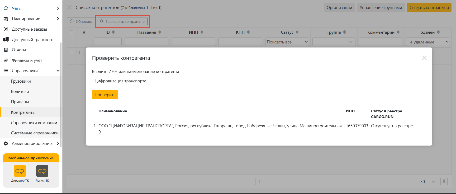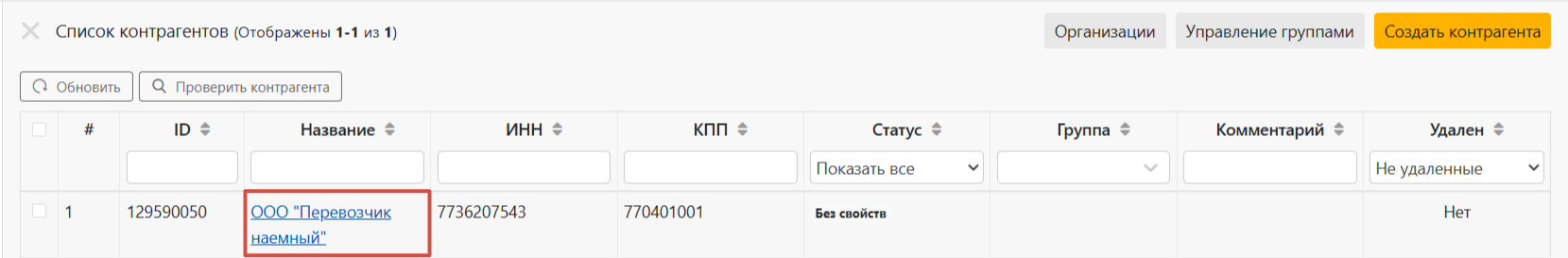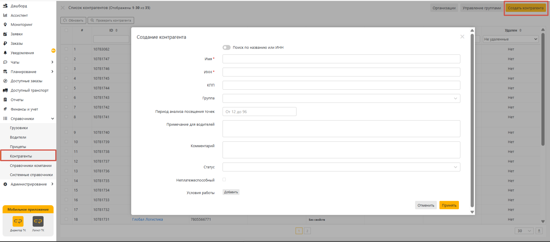 1. Под полем поиска появится кнопка «Создать контрагента»/«Создать водителя»/ «Создать машину»/«Создать прицеп».