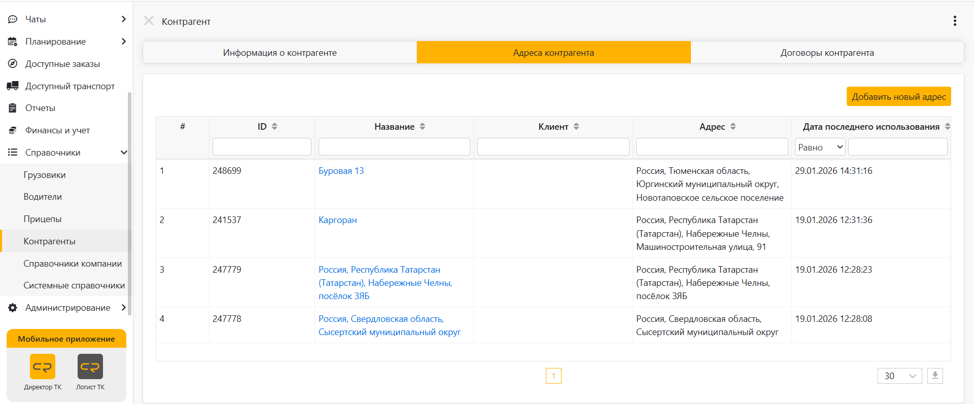 Во вкладке «Адреса контрагента» можно сохранить часто используемые точки погрузки и выгрузки. При создании заявки адрес можно будет выбрать из выпадающего списка за пару секунд. Адреса можно редактировать и удалять.