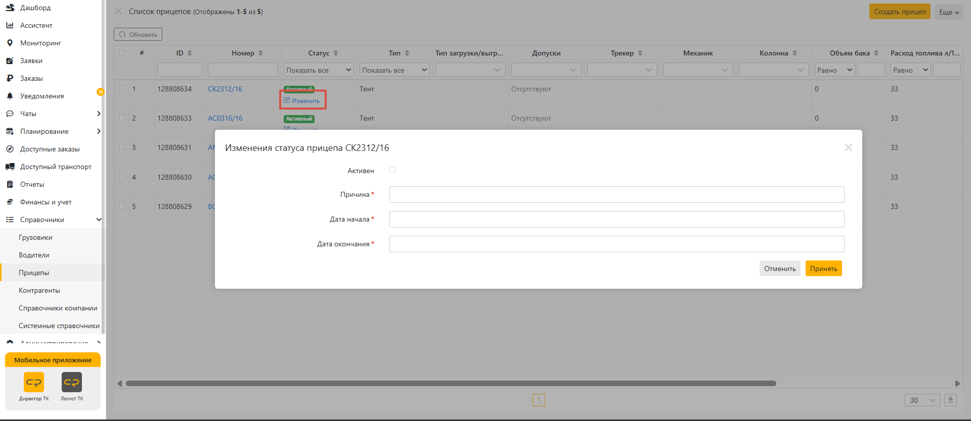 Как и с грузовиками, вы можете перевести прицеп в «Неактивный» статус, если он на ремонте или ТО. Тогда система исключит его из выбора при создании заявок.