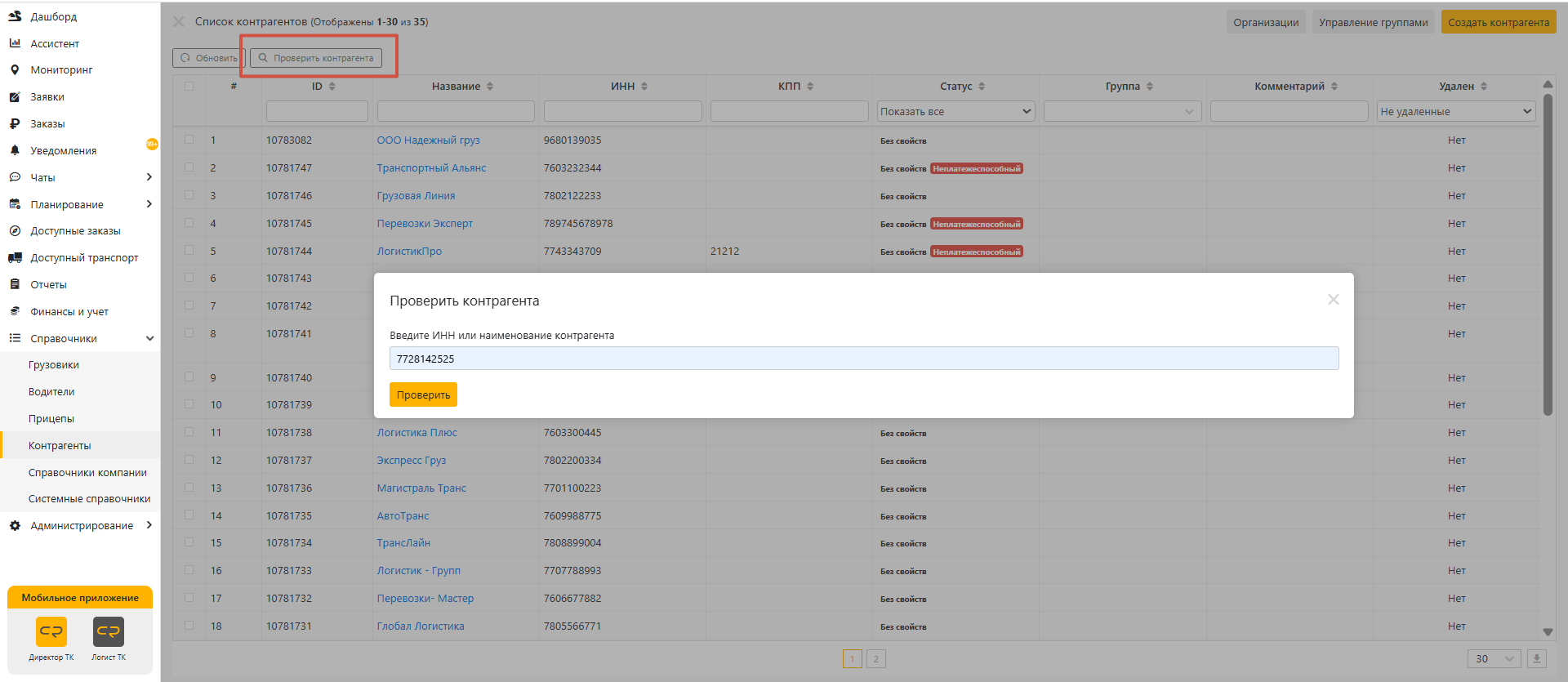 Прежде чем начать работу, проверьте контрагента. В списке контрагентов в левом верхнем углу есть кнопка «Проверить контрагента». Поиск осуществляется по ИНН или названию.