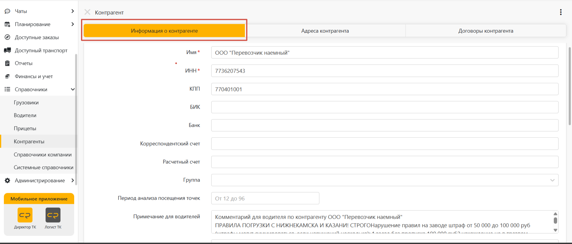 Вкладка «Информация о контрагенте». Здесь хранятся контактные лица, банковские реквизиты, а также поле «Примечание для водителей» (например, «звонить за 2 часа до прибытия») и контактные данные ответственного сотрудника от контрагента.