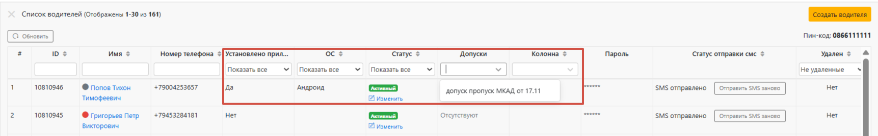 Фильтр «Допуски»: позволяет найти машины, у которых есть все выбранные разрешения одновременно (принцип «И»).