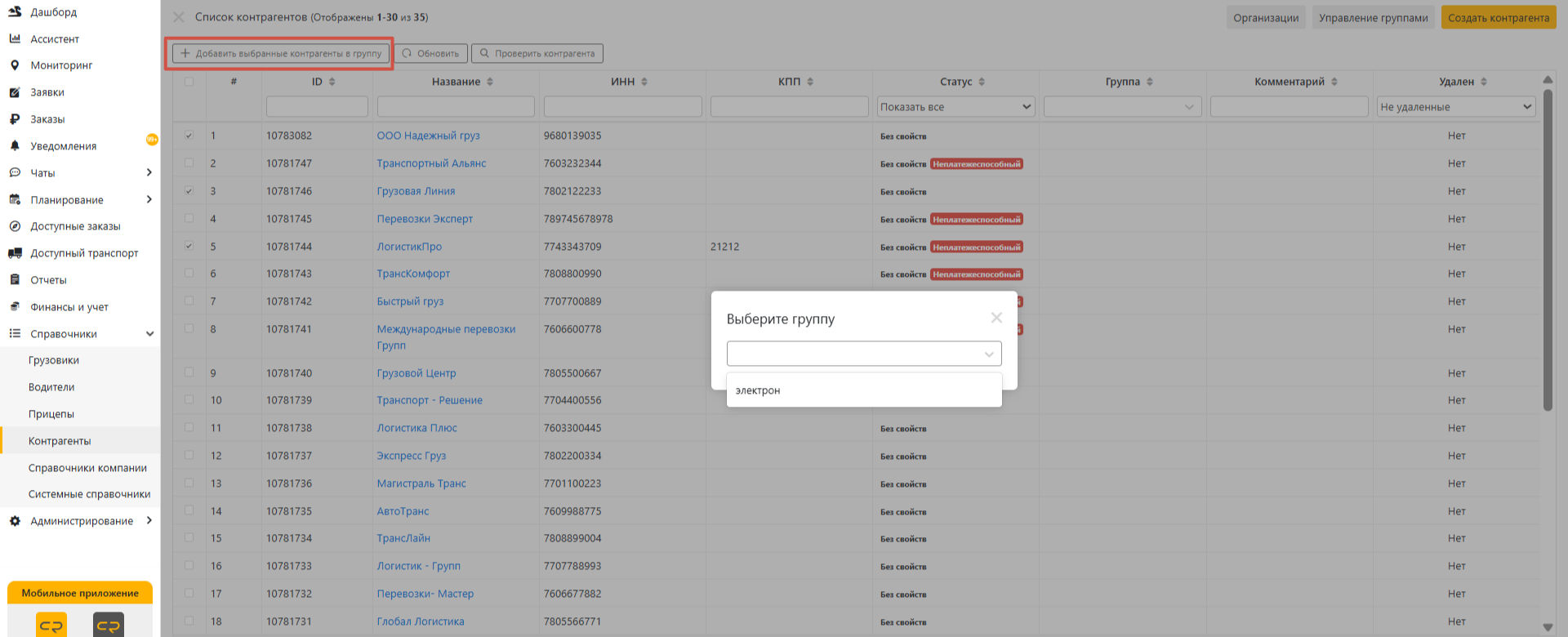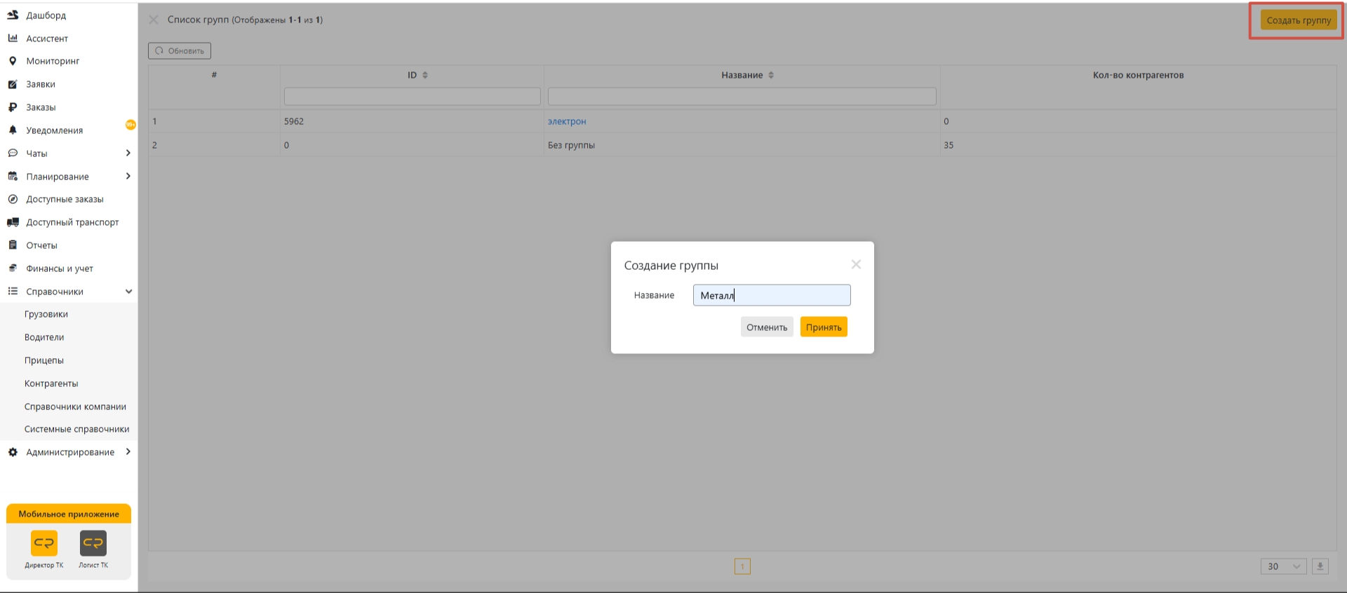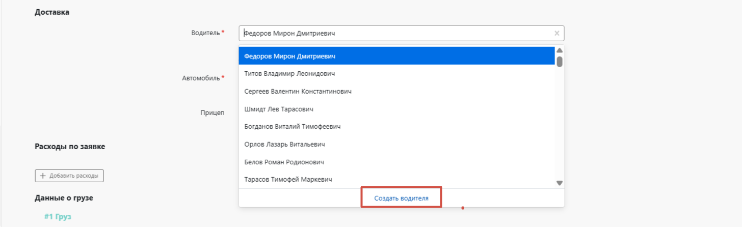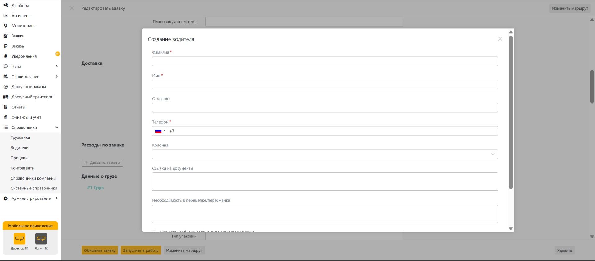 Есть возможность создавать новые элементы справочников (контрагенты, машины, водители, прицепы) непосредственно при работе с заявкой, не переходя на отдельные страницы.