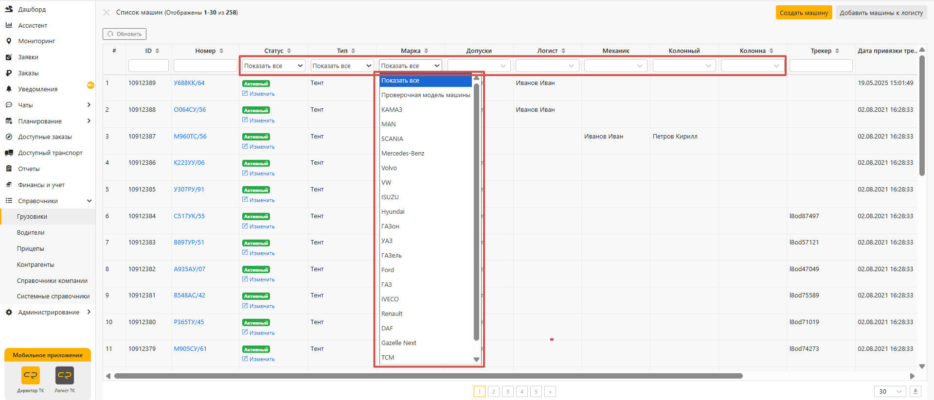 Другие фильтры: по логисту, механику, начальнику колонны, номеру трекера.