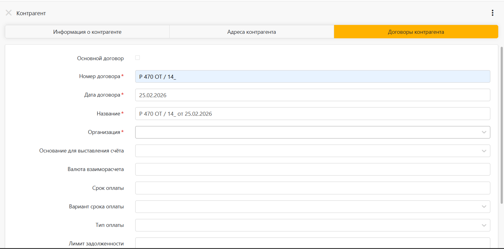 При добавлении договора заполните поля (обязательные помечены «звездочкой»):