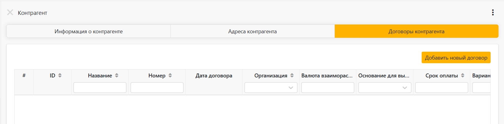 Вкладка «Договоры контрагента». Здесь содержится юридическая и финансовая основа для взаиморасчётов с контрагентом. Система будет автоматически подсвечивать просроченные платежи на основе срока оплаты, указанного в договоре.