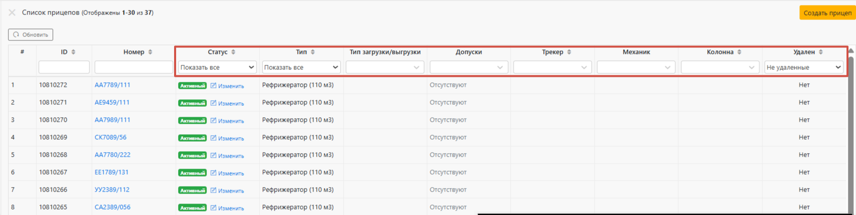 Вы можете фильтровать прицепы по госномеру, типу, типу загрузки, допускам, трекеру или статусу. Например, отфильтровать список, чтобы увидеть только активные рефрижераторы.