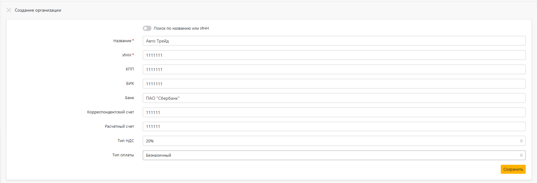 Если отметить одну из ваших организаций как «Основную», система будет подставлять её автоматически.
