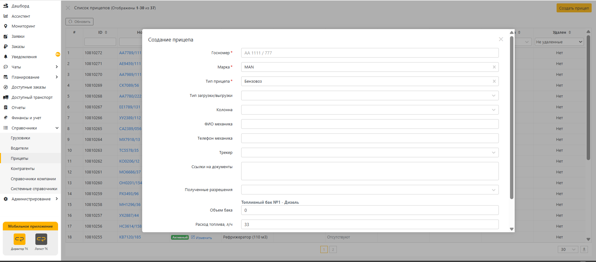 Справочник работает по тому же принципу, что и «Грузовики». Прицепы — критически важное поле в заявке: если в карточке прицепа указан верный тип, система может автоматически рекомендовать его для загрузки.