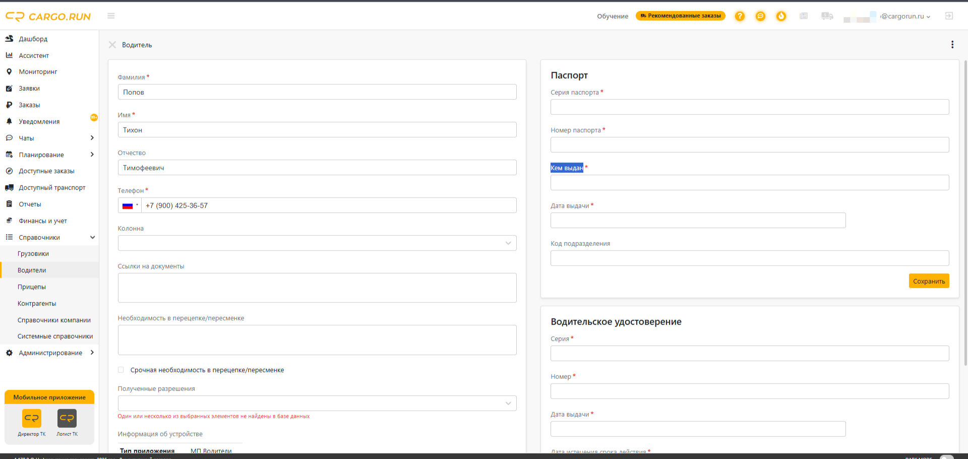 Поле «Полученные разрешения» (например, пропуск на МКАД, медкнижка). Разрешения создаются специалистами CARGO.RUN, обратитесь в техподдержку через виджет чата.