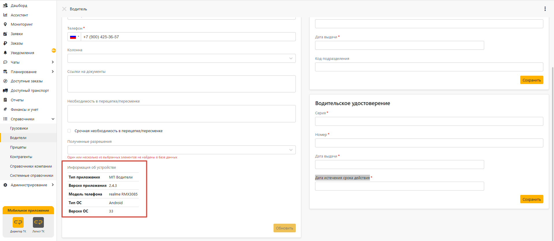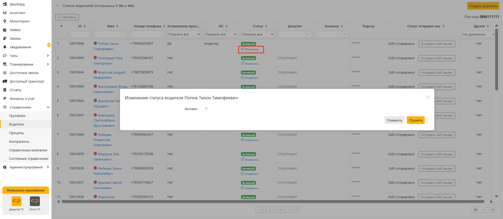 Этот функционал связан с модулем начальников колонн. Если водитель в отпуске или на больничном, переведите его в статус «Неактивен» через кнопку «Изменить». Тогда он исчезнет из выпадающих списков при создании заявок, и вы не назначите рейс отсутствующему сотруднику.